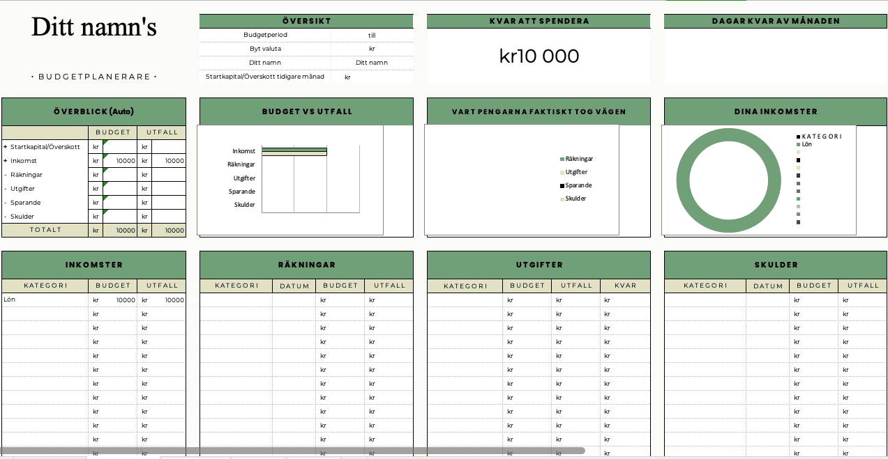 Du ser direkt hur mycket du har kvar att röra dig med, hur många dagar det ska räcka och exakt vart dina pengar faktiskt tar vägen. Tre inbyggda diagram visar din budget mot ditt faktiska utfall, fördelningen av dina utgifter och dina inkomster i överblick. Allt uppdateras automatiskt när du fyller i.