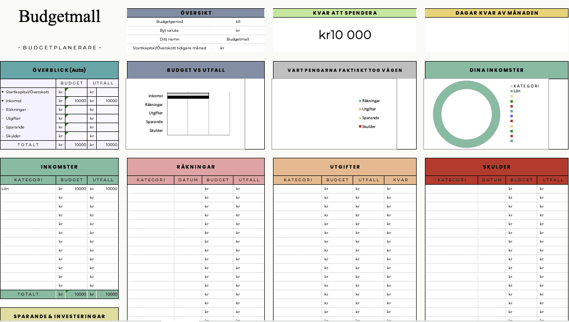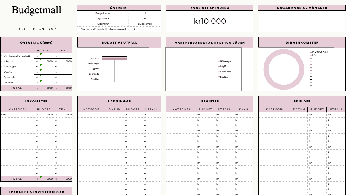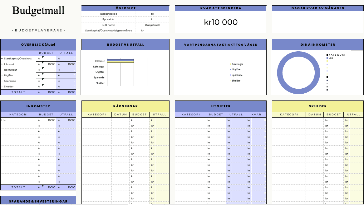 En färdig budgetmall i Excel med fyra olika teman att välja mellan. Sektioner för inkomster, räkningar, utgifter, sparande och skulder. Automatisk beräkning av vad du har kvar att spendera och hur många dagar det ska räcka. Diagram som visar din budget mot utfall, vart pengarna tar vägen och dina inkomster i överblick.