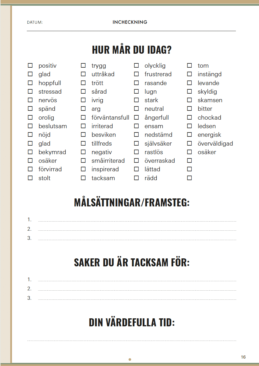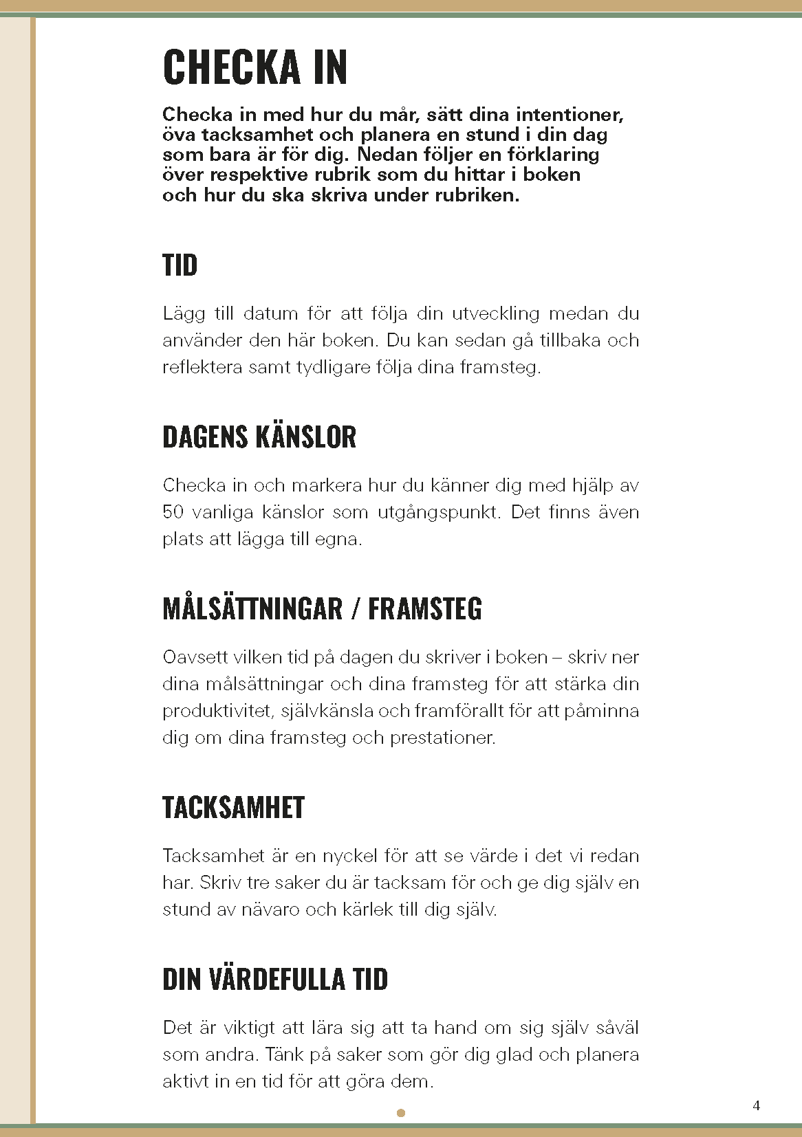 Varje session börjar med en incheckning där du stannar upp, markerar hur du mår, sätter ett litet mål och skriver ner vad du är tacksam för. Sedan går du in i övningarna.