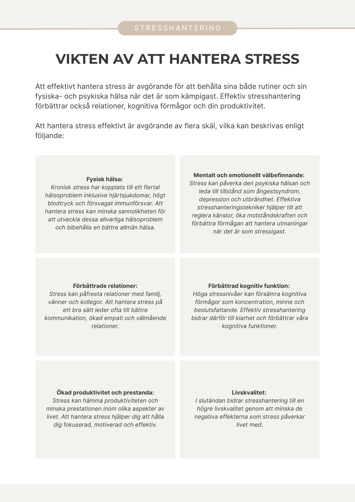 En genomgång av vad stress faktiskt är och hur du känner igen dina egna varningssignaler. Konkreta tekniker för att hantera stress i stunden. Verktyg för att förändra tankemönster och bygga bättre vanor. En personlig stresshanteringsplan du kan använda direkt i din vardag.