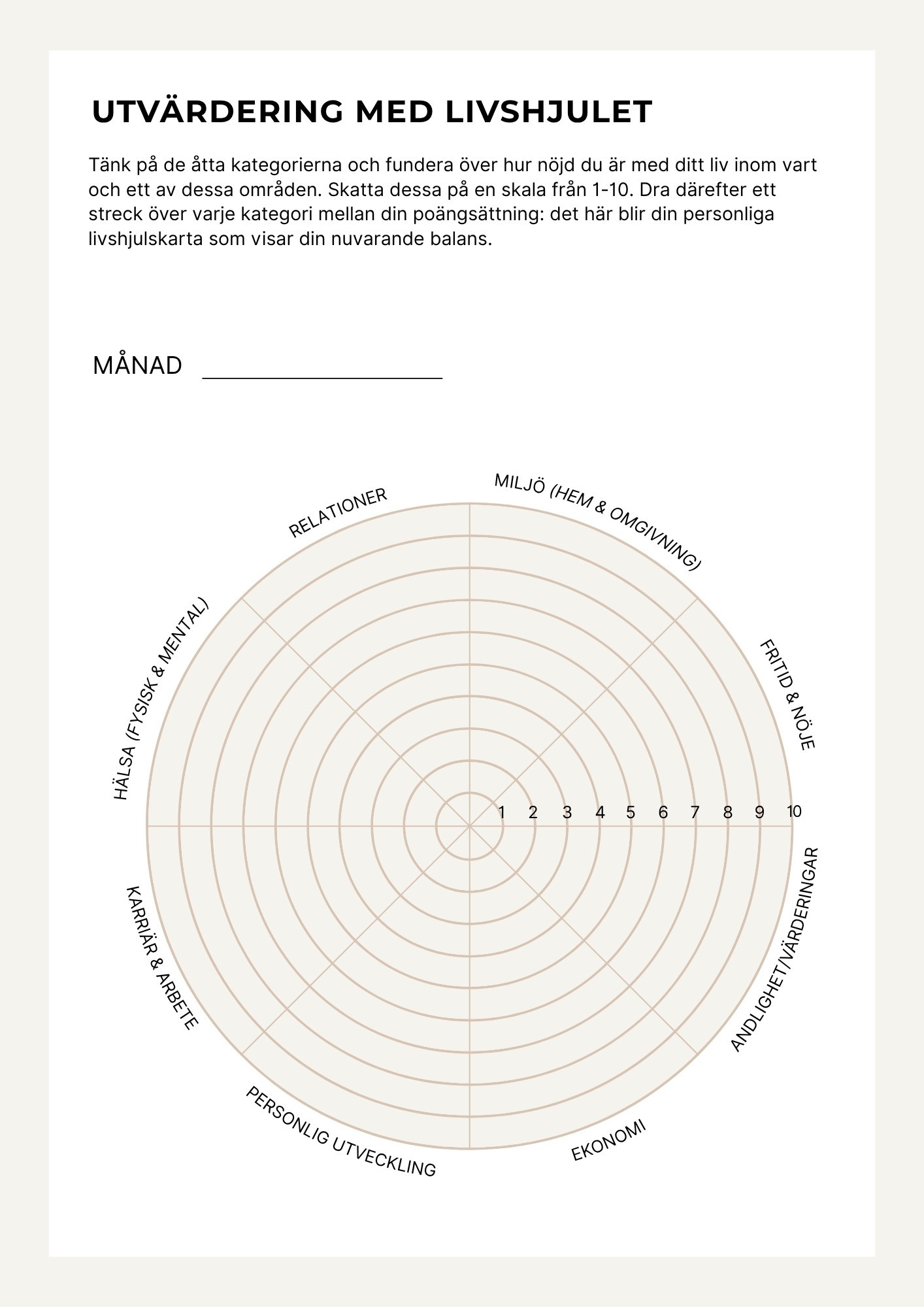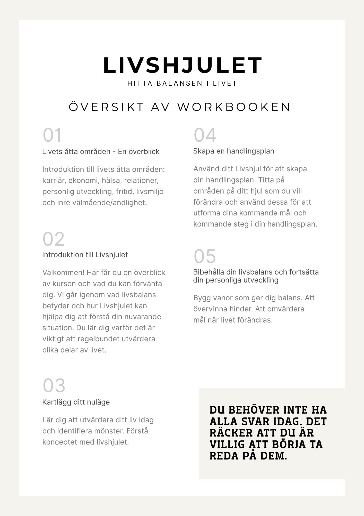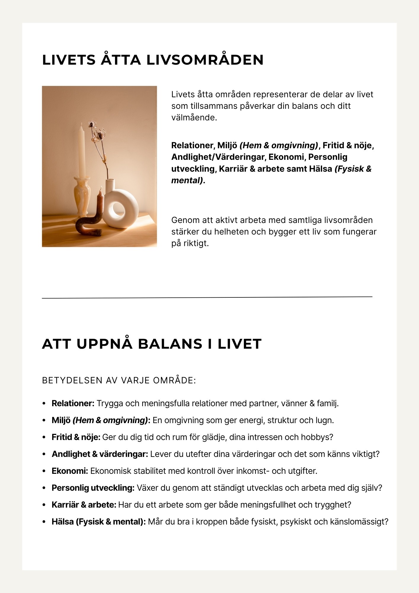 En genomgång av livets åtta livsområden och vad balans faktiskt innebär. En självskattning där du ser exakt var du är idag och var du vill vara. Hjälp att identifiera vilka områden som behöver mest fokus just nu. Konkreta mål, en detaljerad handlingsplan och en månadsplan för att komma igång.