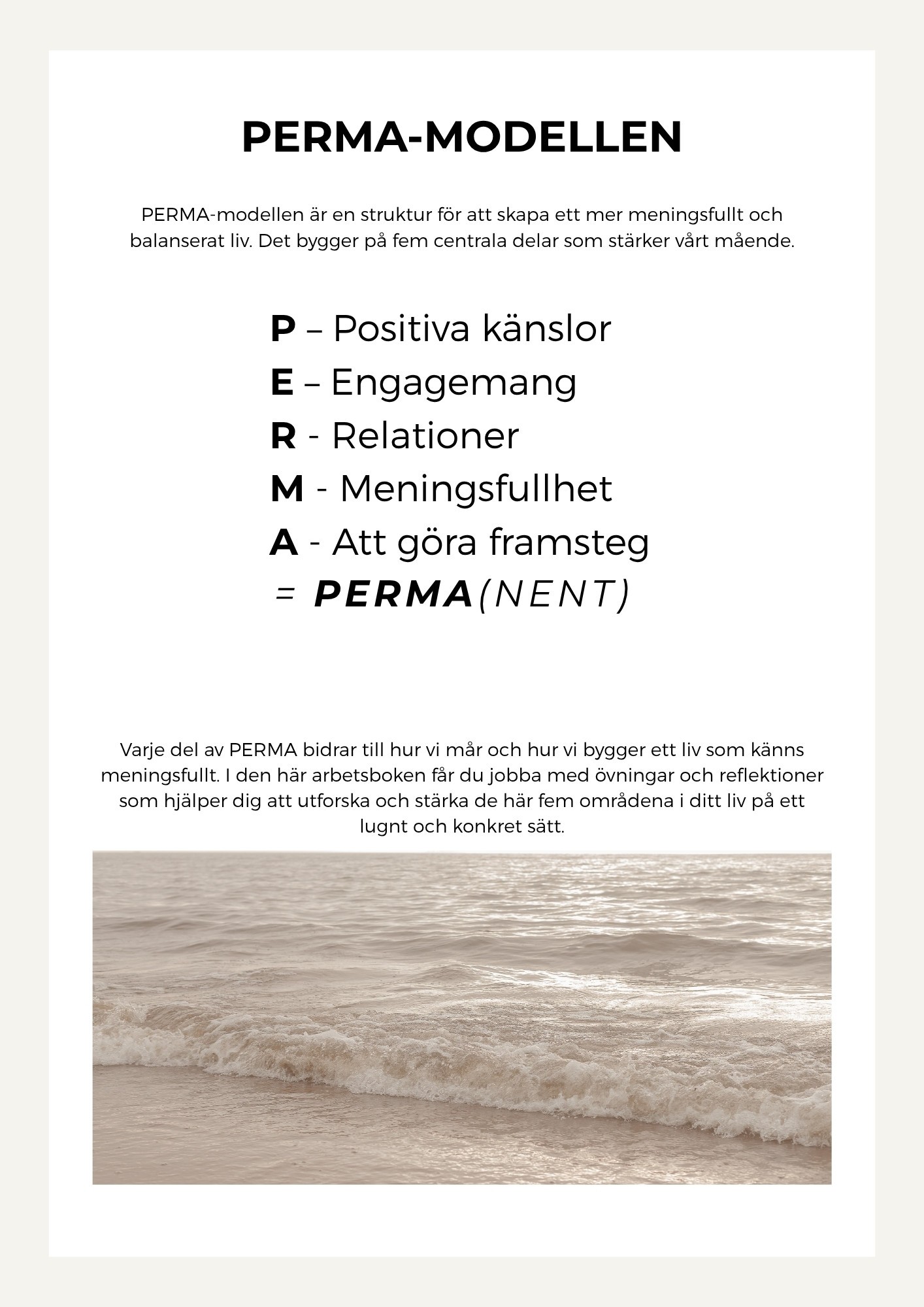 Att inte må dåligt är inte samma sak som att må bra. PERMA är ett vetenskapligt förankrat ramverk från positiv psykologi som visar dig exakt vad som bygger ett välmående liv. Inte vad du borde känna. Utan vad som faktiskt fungerar. Den här arbetsboken tar dig igenom det steg för steg och gör det konkret, mätbart och möjligt att jobba med varje vecka.