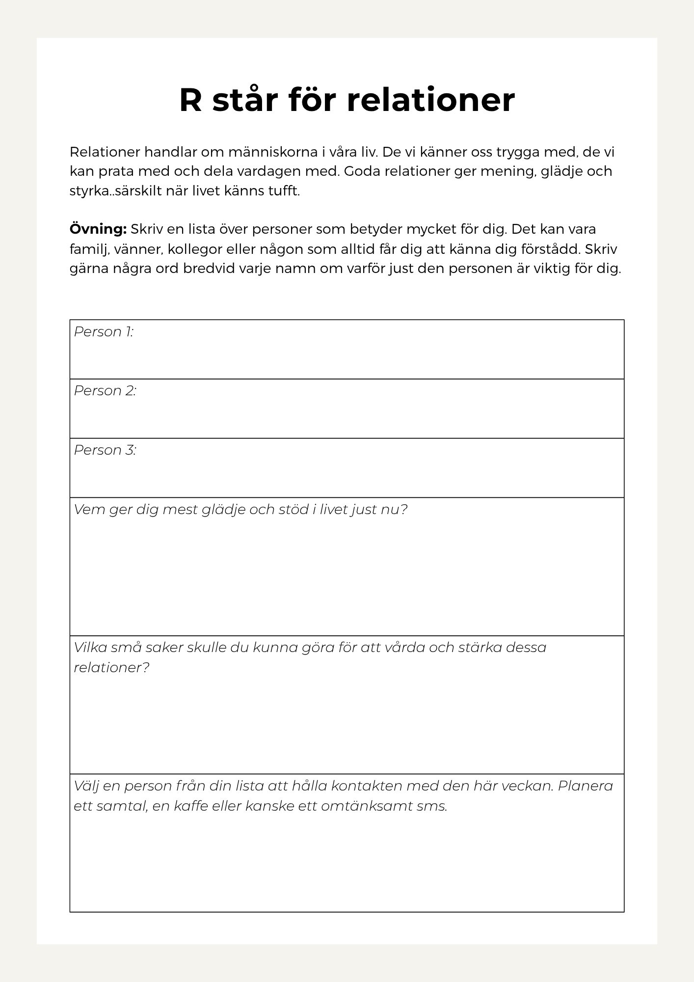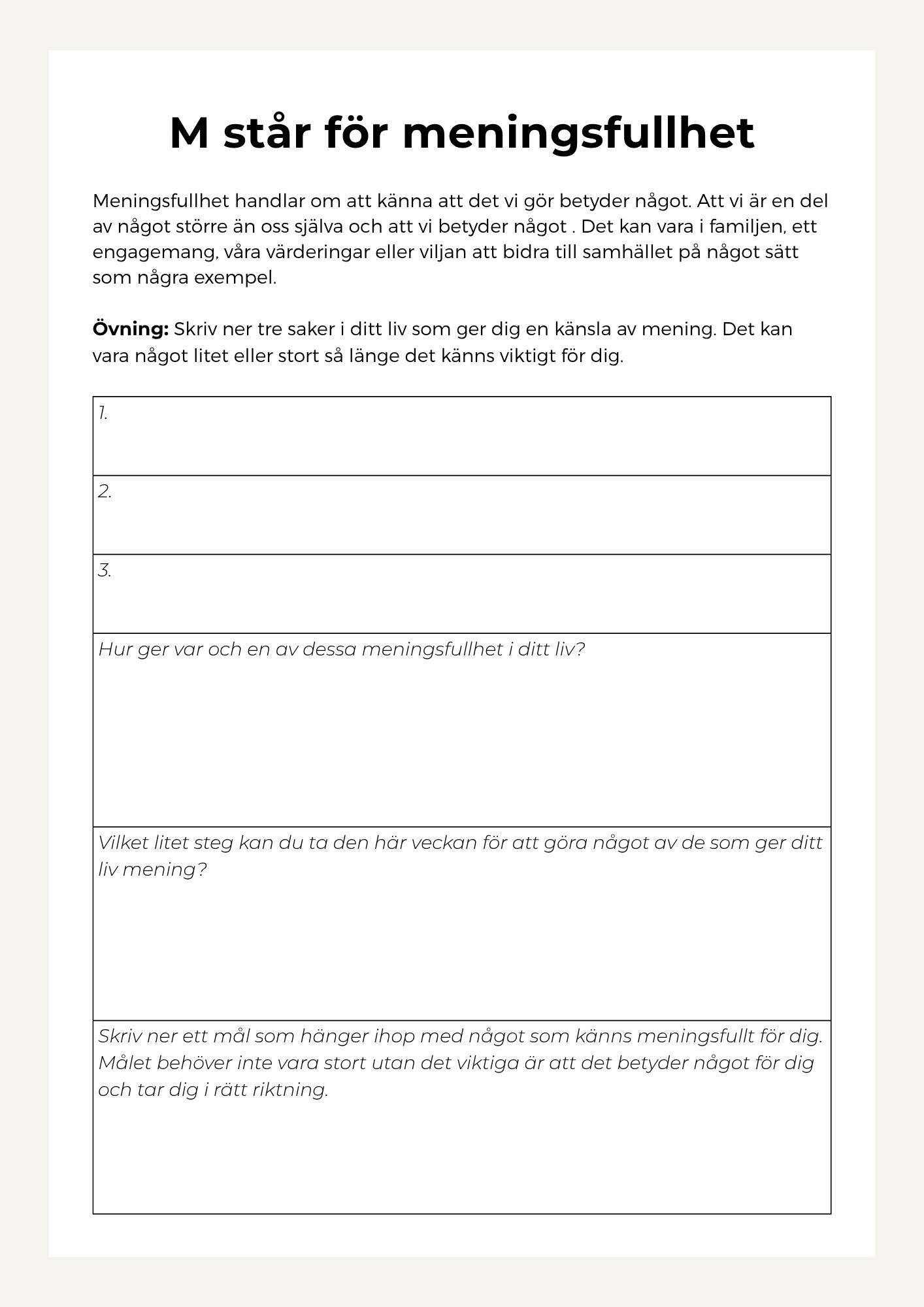 Du tränar på att uppmärksamma positiva stunder i vardagen, dag för dag under en hel vecka. Du identifierar aktiviteter som sätter dig i flow. Du reflekterar över dina viktigaste relationer och tar ett konkret steg för att vårda dem. Du kopplar dina handlingar till det som ger ditt liv mening. Och du lär dig att se och fira dina framsteg, även de som känns för små för att räknas.